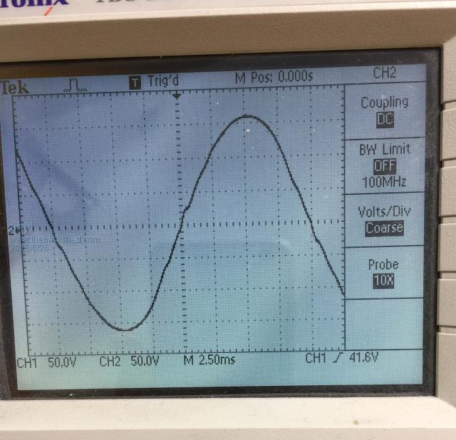With the EG8010 SPWMEN at gnd, the current draw from the 54vdc is 0.01 amp. With the SPWMEN at +5vdc, the current draw is 0.18 amp. Connecting my old 'scope at the output, I get this screen picture. Note the often seen distortion near zero crossing.