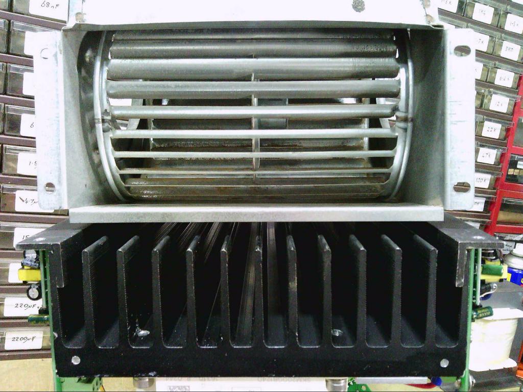 It will be more efficient, with a lower pressure drop if you feed the air blower into the middle of the heatsink, so that half the air goes up, and half the air goes down (onto the transformers). That is how I did mine.