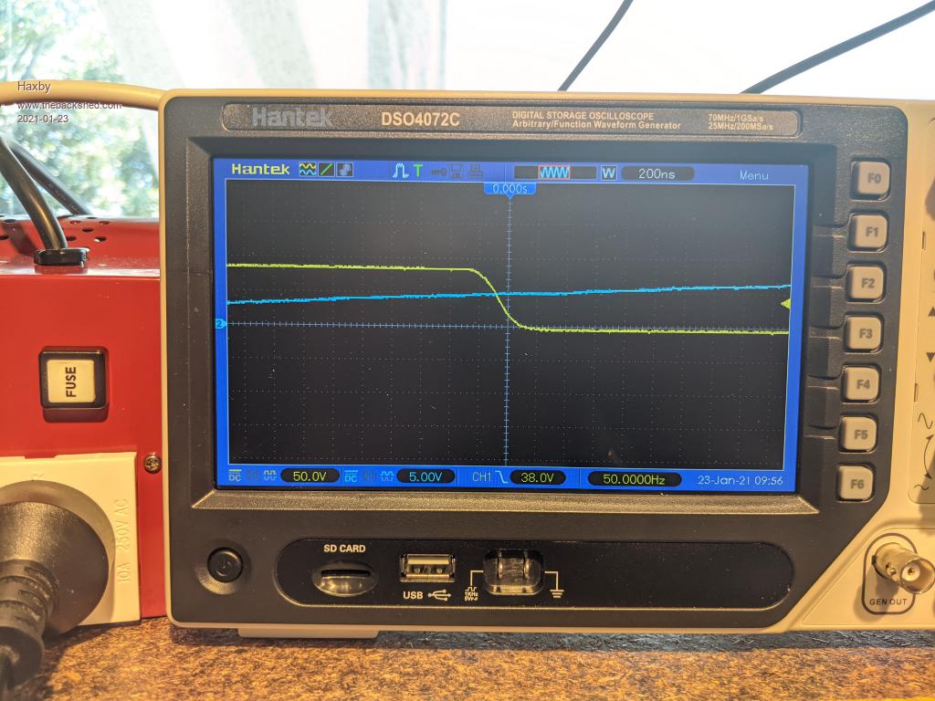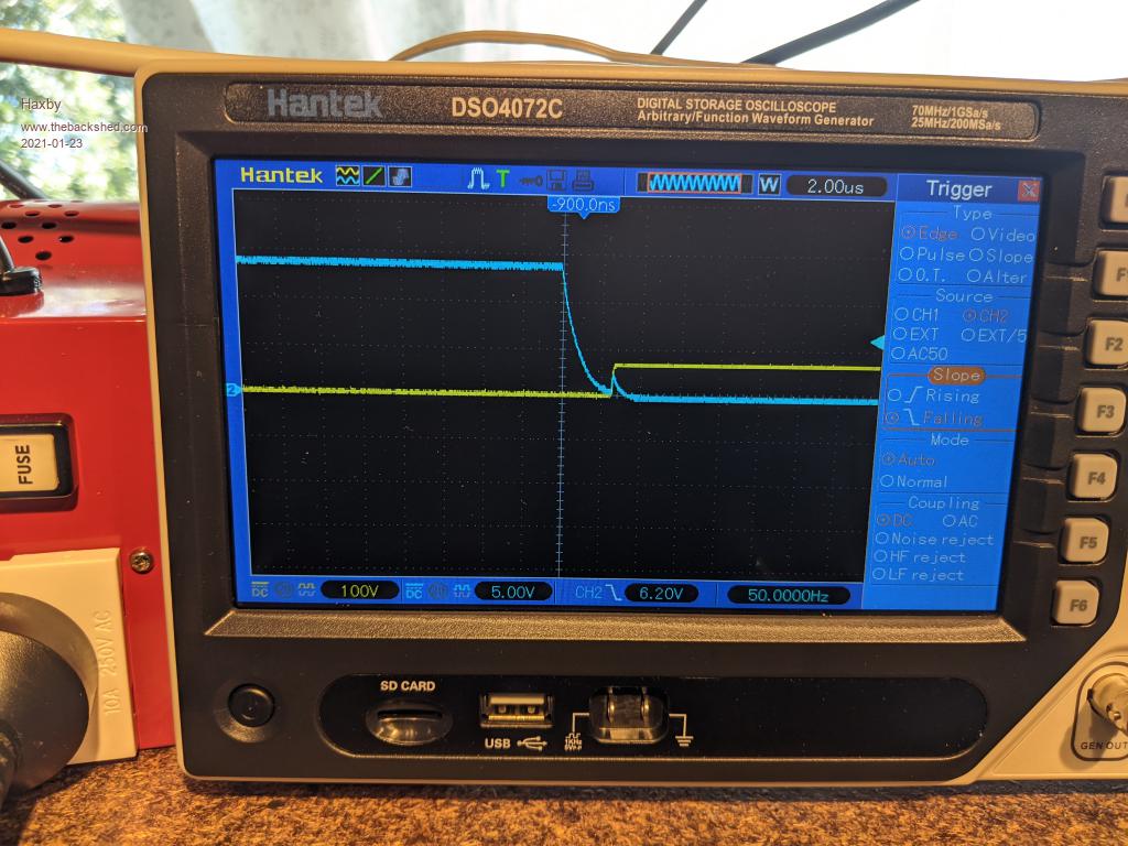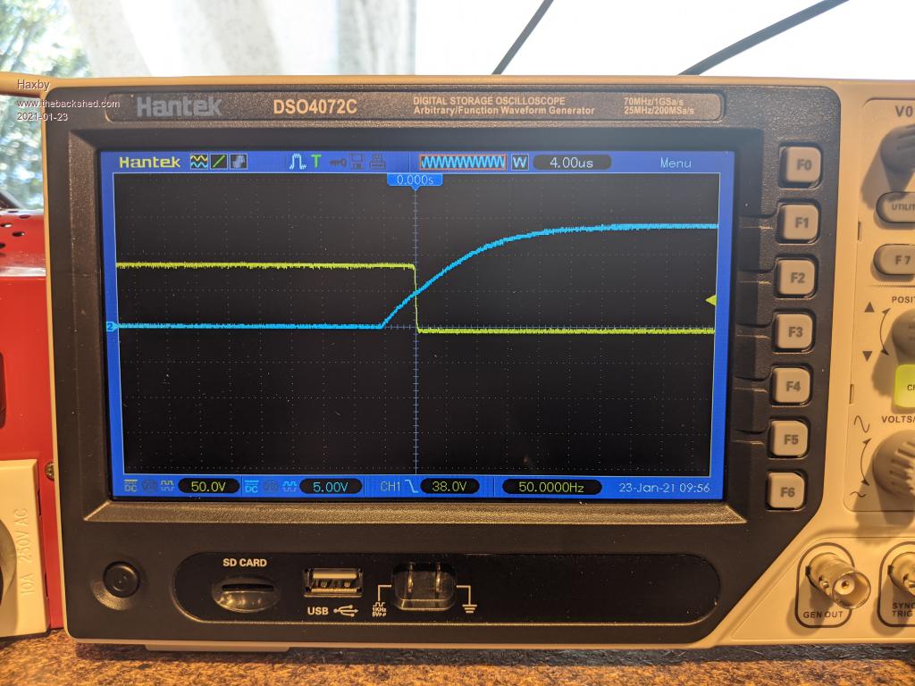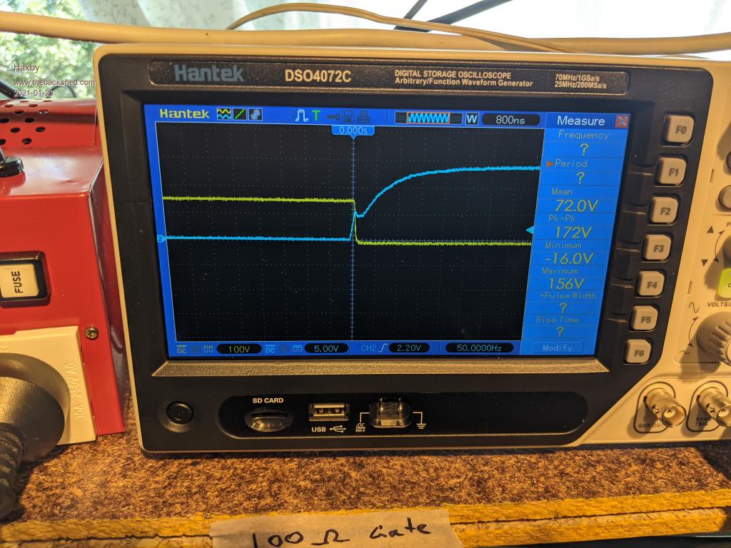 I think I have found a reasonable compromise with the following gate drive components: 47 ohm gate drive resistor. 6.7 ohm resistor and diode across gate drive resistor to aid in turn-off time. 82nF capacitor across gate to slow down turn-on time and to stop the gate from being capacitively coupled to an on state when a fast voltage transition occurs at the drain. All that looked good on the DSO, so I attached a transformer and turned up the DC voltage to 250v. Now there is a new puzzle to solve: The transformer is saturating mildly due to a strange offset effect that I captured on video. here The video shows me turning up the voltage on the Variac. At the 30 second mark, I'm up to 250v, and you can see the yellow trace starting to climb from zero, to around 20v. This is enough of an offset to saturate the transformer core, and if you turn up your speakers, you can hear the transformer start to buzz. If I don't turn off the power, the transformer settles down but cycles through this seemingly at random. It only happens at 200v or more. Any ideas? |