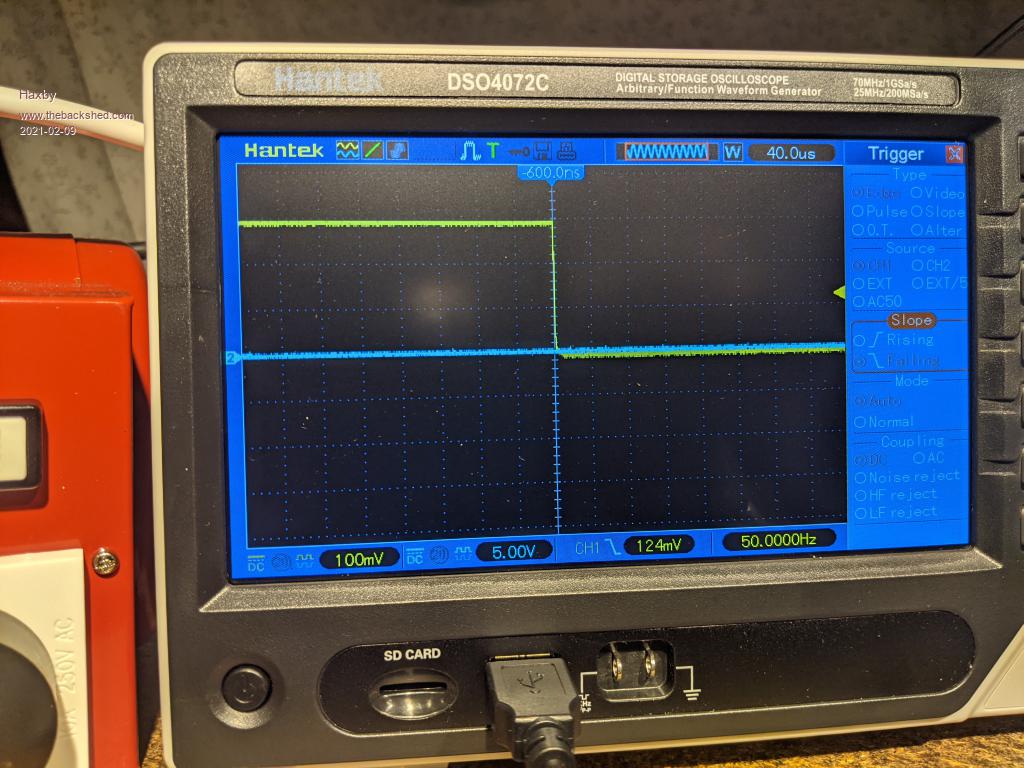 Gents, just a quick update: After learning about, and witnessing, the surprisingly large coupling effects of high voltages on the gate traces, I decided to add TVS diodes to all gates, so I had to pause the build till they arrived. They arrived today, so I'll be working on the project this week. While I was waiting for the TVS diodes to arrive, I was checking all gate drivers again and for the second time I found a gate driver IC that was exhibiting strange behaviour. This is the second one I found with the same fault. The ON time is fine but the OFF time is not good. I post this as a word of warning to make sure anyone building any inverter looks at the on/off times of every gate after a fireworks event. Here is a trace of a bad one: ![]() And here is what it should look like: |