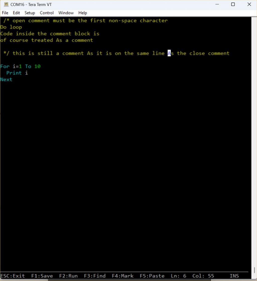 V5.07.08b15 https://geoffg.net/Downloads/picomite/PicoMite_Beta.zip Now includes full support for multiline comments Use /* to start a comment Use */ to end a comment This should be properly supported including colour coding in the editor but note /* and */ must be the first non-space characters at the start of a line and have a space or end-of-line after them (i.e. they are MMBasic commands) Any characters after */ on a line are also treated as comment I'm quite pleased with this. Note in the editor how the colour coding of the whole page changes as you enter or delete the multiline comment chatacters ![]() Edited 2023-09-04 23:28 by matherp |