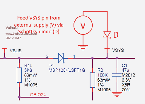 Raspberry Pi Pico documentation The Raspberry Pi Pico Datasheet, sections 4.4 (Powerchain), 4.5 (Powering Pico) and 4.6 (Using a Battery Charger) is the definitive information on powering these devices. :) The main thing is that you mustn't power the Pico via its VBUS pin unless you can guarantee that the USB won't be connected. If you don't follow this rule the computer's USB chip may get damaged. Powering via VSYS is ok as it is fed from VBUS via a diode. This prevents the back-feed. You can also power at 3V3 (into the 3V3 pin) from an external regulator. If you do this then you should connect 3V3EN to GND to disable the on-board switching supply. Mick Zilog Inside! nascom.info for Nascom & Gemini Preliminary MMBasic docs & my PCB designs |