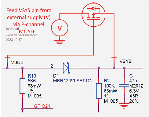 I agree with Lizby. @Volhout Two questions: 1. Which P-channel MOSFET do you suggest? 2. In case 6 we have to connect the output current (+) to VSYS, right? Sketch 2 is build on sketch 1 and sektch 3 is build on sketch 2. Step by step, very nice. I think that can be summed. Many thanks Edit: In sketch 2 and 3 is the Gain of the Mosfet connected to VBUS. Is 5V power on the USB connector or VBUS, the battery will be switched to off. Right? Gregor Edited 2023-10-18 04:49 by aFox |