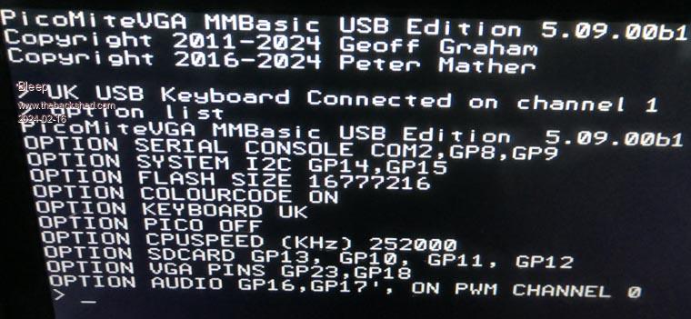 Kevin The board was correctly configured and tested when posted and should have worked out of the box. If possible try with teraterm on windows. The serial port is set to 115200. MAKE SURE THE TERMINAL PROGRAM IS SET TO 115200. It tells the CH340 what baudrate to use on the TTL side over the USB descriptor. This is not the same as a CDC port where the baudrate setting doesn't matter Start by re-loading the USBVGA firmware and then do OPTION RESET. The console should then be working with no other options set. Then apply the options as listed. NB: OPTION VGA PINS must be done before OPTION AUDIO Edited 2024-02-16 03:37 by matherp |