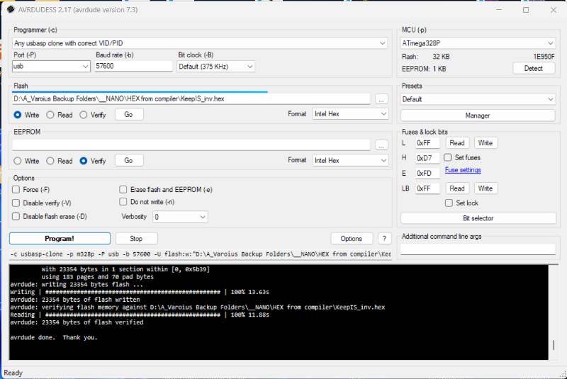 FYI: I have added a footnote to a post on the Programmer board for Hex files. I'll repeat it here in case it's missed: Xloader only works for a Nano with a boot loader and not with a Hex File or programmer board. The correct program to upload a HEX file is AvrDudess. I have uploaded an updated stand alone version with a Screen shot of the setup and the config file should be ready to go, you just need to point the program to the hex file. AvrDudess zip EDIT The security message when downloading is a complaint that the Site is HTTPS but the download location is a HTTP location (not secure site). This is crap as it's from my site, the same site as the HTTPS page, this file is an FTP download - seriously! . Edited 2024-06-08 18:28 by KeepIS NANO:Inverter V 8.2ks - Linux AvrDude GUI script V4.1 |