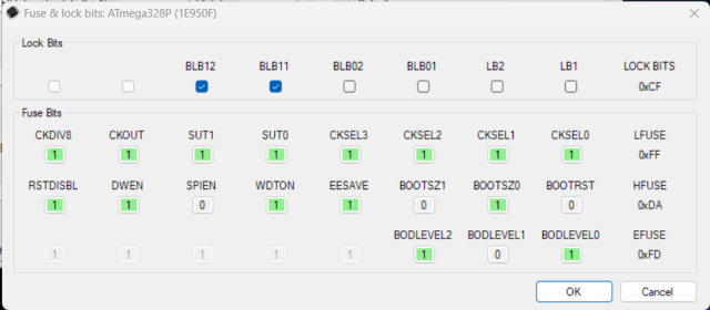2: Setting and Reading the Nano configuration Fuses: Nano Fuses are "programmable nonvolatile registers", one is used to stop EEprom data "Inverter settings", from being overwritten, "lost" when Nano Flash is erased or when uploading New inverter HEX code to the Nano. 1: Press the lower Read button on the "Fuse & lock bits" frame. 2: Press the long "Bit selector" button. See Last post for the location: The following image is likely what you will see for a New Nano board. The two blue boxes BLB12, BLB11, are the boot loader protect bits. They stop that area of Flash memory from being overwritten when uploading standard Arduino code files via the boot loader and USB port in the Arduino IDE. Below: New Nano with boot-loader Config bits. ![]() Below is what we want the bits to look like. ![]() Now, there is something strange going on when reading and setting these Bits but doing the following works. 1: Read the Top "L" block 2: Set the Bit boxes to look like the last image above. 3: Press "OK" to close the popup window. 4: Press the Top write button. 5: Press the Lower "LB" write button. Now repeat with the lower block 1: Read the Lower "LB" block. If it EESAVE is not equal to 0, do the following: 2: Set the Bit boxes to look like the last image above. 3: Press "OK" to close the popup window. 4: Press the Lower write button. Now confirm both read the same. The Main setting we really need correct is EESAVE "it must be 0" Saving and restoring Inverter configuration and setup to follow . NANO:Inverter V 8.2ks - Linux AvrDude GUI script V4.1 |