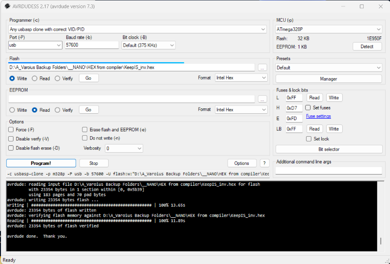This is a Nano I've had for around a year, it's from Keyestudio, a bit expensive though. Th first one I've seen with a crystal next to a CH340 USB controller. The mod is similar to the previous posted Board 2. I posted this somewhere else but I'll repeat it here. I finally downloaded that file I was after and it only gives two BOR options, the lower voltage setting is marked as reserved. The Nanos I have checked are set to Mid setting of between 2.5 - 2.7 range. I will go through the other clones when I add the headers. The lowest setting is marked as reserved. (No 1.8v option shown) I have to say that using the small Programmer with a modified Nano is actually nice because: When writing code in the Arduino IDE and then uploading it to test, requires any other program using the Com port, like a Console Terminal program to be disconnected, after the upload has finished, it has to be reconnected again. It does not sound like much, but after a while it grinds on me. Using the Programmer with AvrDudess allows you to point this program to the compiler output directory used by the IDE. So I build-verify the code in the IDE as normal, then Press Upload in the AVR program window and it's done. Yes you can do this with the IDE, but there are options available to speed the upload up which are not available in the IDE - you can go behind the scenes and make edits, but what a PIA. The big advantage is that the USB port on the Nano is not used to program, it remains connected the the Terminal Coms program, and debug or other output streams to the Terminal program when the upload is finished. . NANO:Inverter V 8.2ks - Linux AvrDude GUI script V4.1 |