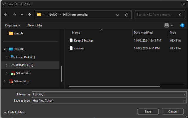Backing up the Nano inverter settings: Once you have setup the Inverter and calibrated inputs, It is a good idea to backup your settings just in case, a lot easier then having to re-calibrate and set everything up again. Below is the setup screen we used to upload the Inverter HEX file. Select the round "Read" option in the "EEPROM" frame. ![]() When you Click on the [...] button at the end of the EEPROM file line, you will open a window something like the following: If a file exists it will be overwritten, type a new file name and it will be created when the EEprom from the Nano is read. ![]() To Backup: Press the "Go" Button below the EEPROM Backup File entry line on AVRDUDESS. It's surrounded in a blue border in the Image below. This is what you should see after an EEprom read / backup, check the Black output window at the bottom. ![]() Below: To restore The Inverter backup EEprom file: Same as above but Select the File to restore from, select the "Write" option below the File name line, press the "Go" button. ![]() Restoring EEprom configuration Data does not affect the Main Code in the Nano. Once restored you should delete the File path in from File line, this stops any accidental writing or reading to the EEprom or your Backup file. Note: The format selection below the end of each File entry Line must always be HEX. . Footnote added 2024-06-12 18:12 by KeepIS Correction Under the first Image: You may have to use your chosen Directory viewer and create a Directory to keep the EEprom backup files in, then create an empty text file with a .HEX extension IE: "EEbackup.hex" in that directory. Load that file into ARVdudess for you first EEprom backup. That file will be overwritten when you "Read" the EEprom. From then on the ARVdudess program will remember that directory path and file name. To makes another backup file, just select the same file and change the file name in the EEprom file name line in Avrdudess. I hope that makes sense. . NANO:Inverter V 8.2ks - Linux AvrDude GUI script V4.1 |