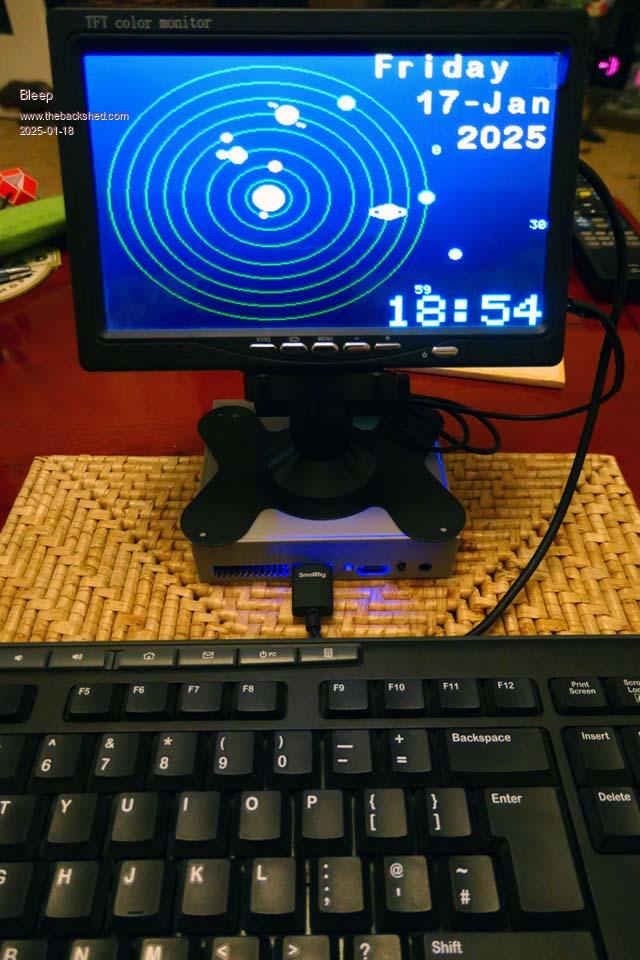 Pluto. Edit. here is a version with modified planets that adjusts to screen size. Looks best on MMB4W ' Converted to Pico MMBasic by Kevin Moore 07/12/2021 ' Based on Python project https://github.com/dr-mod/pico-solar-system ' which uses the planetry equations of motion from http://stjarnhimlen.se/comp/tutorial.html ' I have limited the year between 1901 and 2100 as the equations may not work beyond these. ' Touch points are ' Top Left = Brightness up ' Bottom Left = Brightness down ' Top Right = increase date by a week at a time then a month... ' Bottom Right = decrease date by a week at a time then a month... ' Centre = reset back to todays date, also re-initialise LCD display ' ' turn off default typing Option DEFAULT NONE ' force explicit typing Option EXPLICIT ' turn off blinking LED while running 'SetPin GP25, DOUT ' Screen = 480*320 Const SSF = mm.vres / 320 'Screen Scaling Factor Const width = mm.hres Const height = mm.vres Const onerad = 57.2957795131 Const update = 100 Colour RGB(WHITE), RGB(BLACK) ' Set the default colours Font 1, 3 ' Set the default font Dim m$(11) = ("Jan","Feb","Mar","Apr","May","Jun","Jul","Aug","Sep","Oct","Nov","Dec") Dim planet_name$(9) = ("","Mercury","Venus","Earth","Mars","Jupiter","Saturn","Uranus","Neptune","Moon") Dim STRING dy Dim INTEGER x, y, orbit, year, month, day, hour, min, today = 0, dayb = 80, eveb=30, nightb=2, updb=0 Dim INTEGER dayoff = 0, cuday, cumonth, cuyear, updatescr=update, bright=80, lastb=0, lasthour=24 Dim INTEGER last_pos(1,9) Dim INTEGER rtcl=1 ' do we have a hardware real time clock Dim FLOAT planets_dict(1,9) Dim FLOAT xeclip, yeclip, zeclip, long2, lat2, r, Earthx, Earthy Dim FLOAT feta, coordinatex, coordinatey, seconds, lastsec=60.0, frac_s=0.0 ' set screen backlight to mid value 'Backlight bright ' Solar system centre y = height / 2 x = y Do day = val(Left$(Date$, 2)) hour = val(Left$(Time$, 2)) ' only update planets daily or when changing or when fast scrolling If day <> today Or dayoff >= 2 Then ' re-initialise display once a day at midnight, when date changes ' If dayoff <=1 Then GUI RESET LCDPANEL If dayoff <=4 Then CLS year = val(Right$(Date$, 4)) month = val(Mid$(Date$, 4, 2)) today = day ' hour = val(Left$(Time$, 2)) min = val(Mid$(Time$, 4, 2)) ' call main calculations of planet positions coordinates(year, month, day, hour, min) ' results returned in planets_dict array ' draw Sun If dayoff <=4 Then Circle x, y, 12*SSF, 0, 1,, RGB(YELLOW) Circle x-5*SSF, y+2*SSF, 1*SSF, 0, 1,, RGB(0,0,0) 'Sun spots Circle x-8*SSF, y-3*SSF, .7*SSF, 0, 1,, RGB(0,0,0) Circle x+6*SSF, y-2*SSF, .5*SSF, 0, 1,, RGB(0,0,0) EndIf For orbit = 1 To 9 ' planet and orbit sizeing only for a 340*240 screen ' draw orbit rings r = 18*SSF * orbit + 8*SSF ' change orbit spacing for inner planets If orbit <=3 Then r=r-12+(orbit*2) : If orbit <=1 Then r=r+4 ' for speed, don't draw orbits if fast scrolling the date, no orbit for Moon If dayoff <= 2 And orbit <= 8 Then Circle x, y, r, 1, 1, RGB(110,110,110), -1 : last_pos(0,orbit)=0 : last_pos(1 ,orbit)=0 ' draw planets ' Moon Special is geocentric, all others are Heliocentric If orbit = 9 Then ' Don't draw Moon if fast scrolling If dayoff <= 2 Then feta = Atan2(planets_dict(1,orbit), planets_dict(0,orbit))+1.570796327 r= 13*SSF ' Moon orbit round Earth (keep it close) coordinatex = r * Sin(feta) + Earthx coordinatey = r * Cos(feta) + Earthy Call planet_name$(orbit) ,(coordinatex, coordinatey, last_pos(0,orbit), last_pos(1,orbit)) last_pos(0,orbit) = coordinatex last_pos(1,orbit) = coordinatey EndIf Else feta = Atan2(planets_dict(0,orbit), planets_dict(1,orbit)) coordinatex = r * Sin(feta) + x coordinatey = height - (r * Cos(feta) + y) Call planet_name$(orbit) ,(coordinatex, coordinatey, last_pos(0,orbit), last_pos(1,orbit)) last_pos(0,orbit) = coordinatex last_pos(1,orbit) = coordinatey EndIf If orbit = 3 Then Earthx=coordinatex : Earthy=coordinatey ' save Earth coordinates for Moon calcs. Next orbit ' display current date don't disply day of week if fast scrolling date If dayoff <= 2 Then dy$=Day$(Date$) Text width-214, 32, dy$, "LB", 5, 1, RGB(ORANGE) EndIf Text width-185, 32, Left$(Date$, 3)+m$(val(Mid$(Date$, 4, 2))-1), "LT", 5, 1, RGB(ORANGE) Text width-155, 65, Right$(Date$,4), "LT", 5, 1, RGB(ORANGE) EndIf ' display current time and Pluto unless fast scrolling date If dayoff <= 2 Then seconds = val(Right$(Time$, 2)) If lastsec > seconds Then Text width-166, height-56, Left$(Time$, 5), "LT", 6, 1, RGB(CYAN) : seconds=0 ' update time If seconds <> lastsec Then frac_s=0 lastsec = seconds Else frac_s = frac_s+updatescr EndIf Pluto(seconds+(frac_s/1000)) EndIf ' Update the backlight LED brightness every hour time and month dependent If hour <> lasthour Or updb Then lasthour=hour ' Jan, Nov or Dec If (month=1 Or month=11 Or month=12) And hour>=8 And hour<=15 Then If updb Then dayb=bright : updb=0 bright=dayb ' May, June, July ElseIf (month=5 Or month=6 Or month=7) And hour>=5 And hour<=20 Then If updb Then dayb=bright : updb=0 bright=dayb ' Feb, Oct ElseIf (month=2 Or month=10) And hour>=7 And hour<=16 Then If updb Then dayb=bright : updb=0 bright=dayb ' March, Sept ElseIf (month=3 Or month=9) And hour>=6 And hour<=18 Then If updb Then dayb=bright : updb=0 bright=dayb ' April, Aug ElseIf (month=4 Or month=8) And hour>=5 And hour<=19 Then If updb Then dayb=bright : updb=0 bright=dayb ' Any other time of day Else ' Set to very dim over night. If hour>=23 Or hour <=6 Then If updb Then nightb=bright : updb=0 bright=nightb ' Set to med bright for evening. Else If updb Then eveb=bright : updb=0 bright=eveb EndIf EndIf ' Update actual screen brightnes If bright <> lastb Then lastb=bright' : Backlight bright EndIf Pause updatescr ' wait before doing next screen update If Touch(DOWN) Then ' save todays date for returning later If dayoff = 0 Then cuday = day : cumonth = month : cuyear = year If Touch(X) <160 Then If Touch(Y) <160 Then updb=1 If bright <10 Then bright = bright + 1 Else bright = bright + 5 En