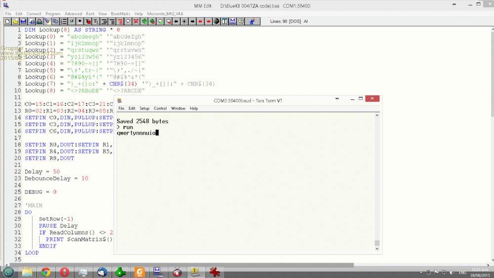 This should make qwertyuio work. The location of the P i can not deduct because it is displayed differently. (Probably teraterm character set) [code] Lookup(0) = "abcdeegh" '"abcdefgh" Lookup(1) = "ijklmnop" '"ijklmnop" Lookup(2) = "qrstuqwx" '"qrstuvwx" Lookup(3) = "yz123w56" '"yz123456" Lookup(4) = "7890-=[]" '"7890-=[]" Lookup(5) = "\;',tr~!" '"\;',./~!" Lookup(6) = "@#$%yi*(" '"@#$%^&*(" Lookup(7) = ")_+{}o:" + CHR$(34) '")_+{}|:" + CHR$(34) Lookup(8) = "<>?ABuDE" '"<>?ABCDE" [/code] Each key will print a row and column. That would help with filling the right values in the lookup table. Each row is the index in the array and each column is the position in the string. Microblocks. Build with logic. |