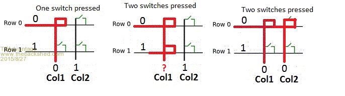 I am testing your code TZA, but my very old-school IF/THEN code should not be able to put shorts where they are not wanted. Using your 8 x 9 chart, when my IF/THEN code polls row1, it is putting a digital 1 on rows 01, 04 and 14 at the same time - a short across ROWS, but they are all outputs, and all on the same common output at any one time. Polling across the columns then finds the key. As each set of rows are set high, polled, then set low again, this should prevent any nasty multi-keypresses from happening, I would have thought, unless I am not seeing something in my head as to the logic of what actually happens with multiple keypresses. ...that would not be a first for me...