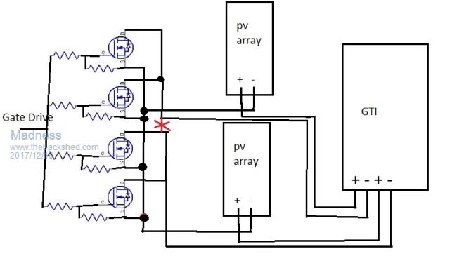 Mad, just a thought. . A lot of gti's have 2 seperate mppt controllers on the inputs. I know the auroras i have you need to switch them to ether parallel or series on their inputs. Maybe something there why it blowing up mosfets when connected drains.