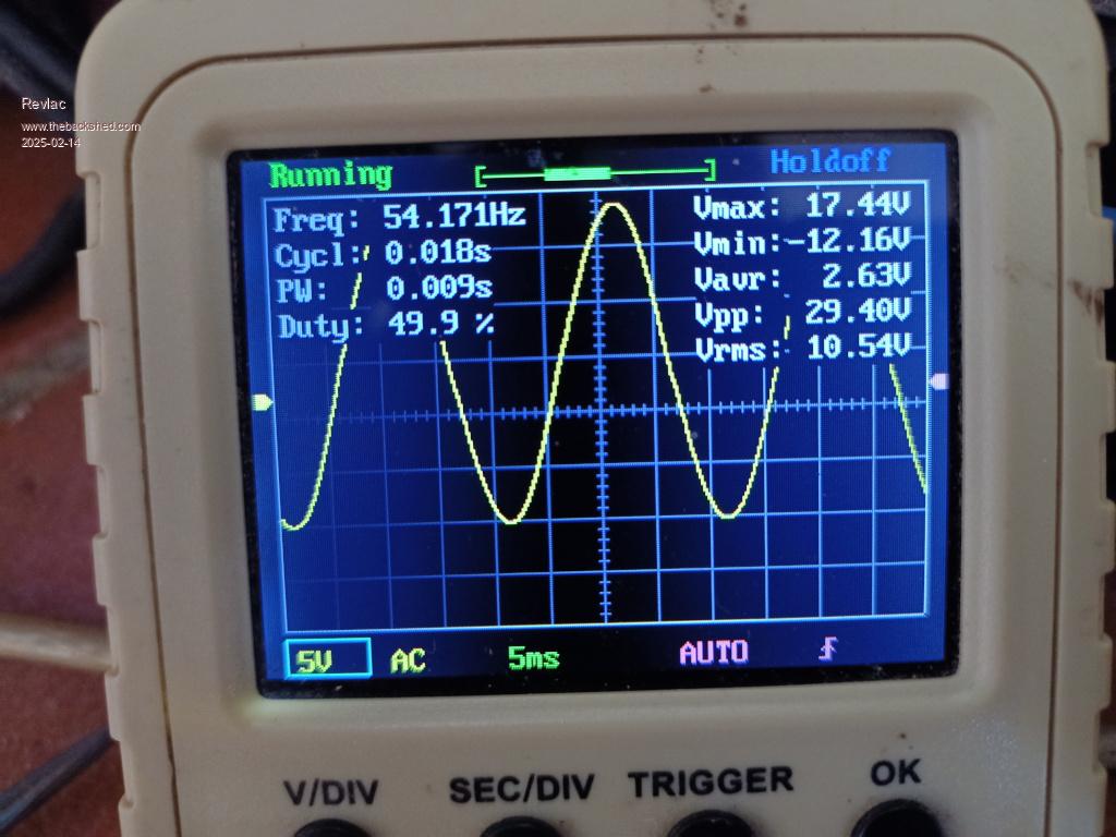 Ignore the 54Hz frequency on the little scope, it often has its own opinion.