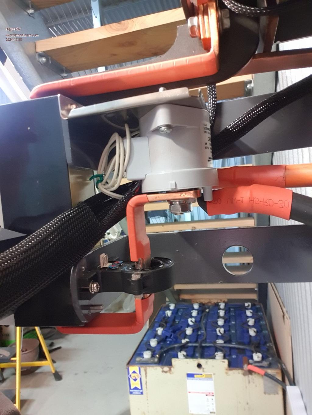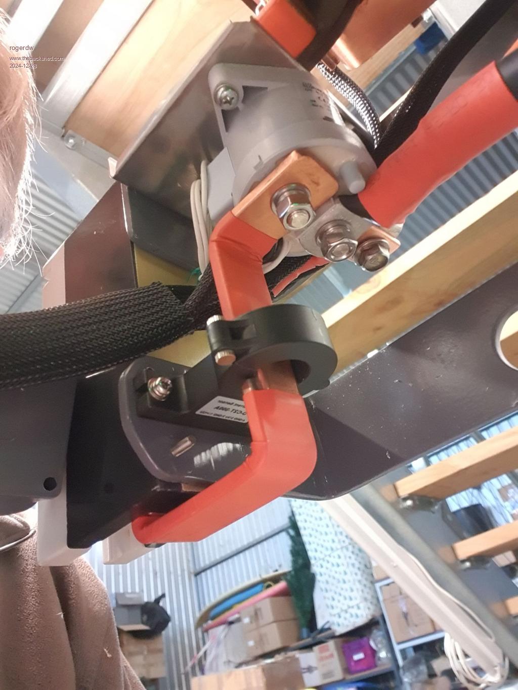 The battery cable and Solar Charge controller leads come in via cable to the Kilovac  ...  then copper bar to the cct breaker  ...  and from the cct breaker to the main busbar