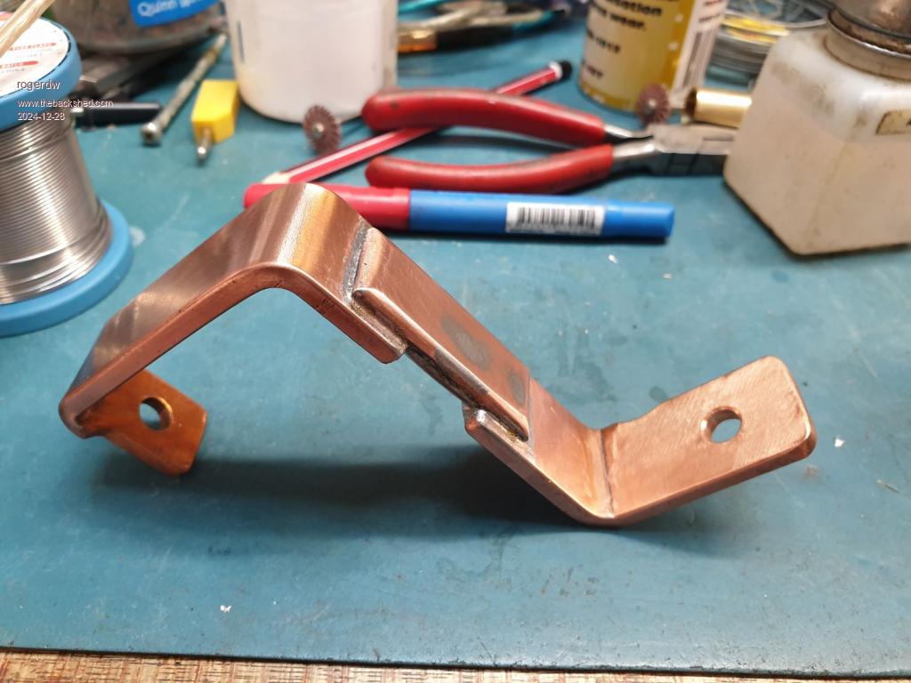 That looks Excellent, very neat Rodger,  that's about what I was thinking of, mostly trying to re purpose what I have on hand there is a few different size's of copper bar salvaged from large transformers, there is also a way of getting a 90 degree bend the other way by putting a 45 degree crease and fold over itself, I had success with thin copper like that but have yet to try some of the thicker stuff, will see what happens.