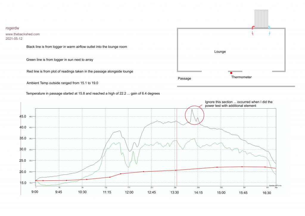 I probably need to work out a better method of containing the heat from an element and combining with the air outlet if I want an exact power level ... but at this stage I am pretty confident to say that the system was putting out over 1,200 watts this afternoon.