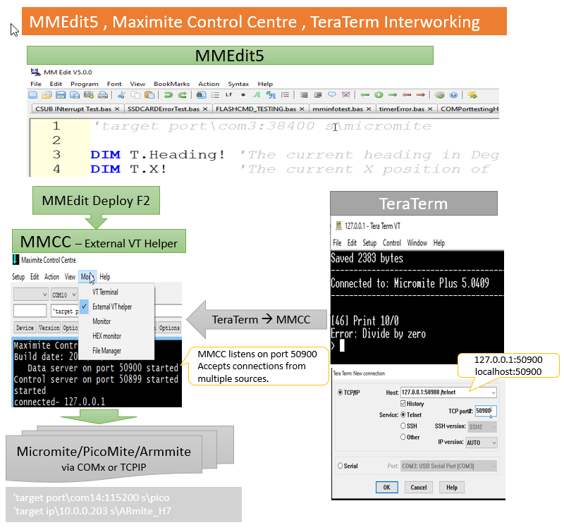 Here is a bit of a diagram I put together showing MMEdit, TeraTerm and MMCC interworking. I find it a very satisfactory setup, with MMEdit managing the code and using Teraterm as the terminal. ![]() F4 H7FotSF4xGT |