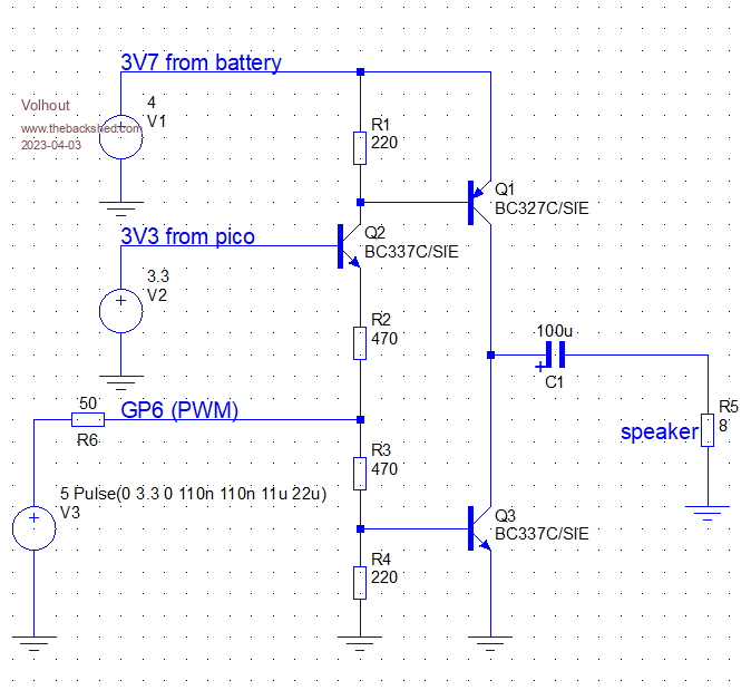 @phil, @mozzie, In case you are looking for a half-bridge with discrete components, my simulation say this would work. The speaker might need a low pass filter (an inductor, maybe capacitor) and a volume potmeter. But this power stage will give you rail-to-rail output with a 3.7V...4.2V battery voltage, and because isolates the 3.3V switchmode ripple, will give you a clean output (as long as the battery voltage is clean). Q1 and Q3 need to be medium power transistors with relatively high gain, such as the BC327/BC337. Q2 can be a standard BC547/BC548 or alike. Resistor values must be as indicated (R3/R2 = 2 x R4/R1) to minimize crossover (current peaks from battery). ![]() Edited 2023-04-03 18:30 by Volhout PicomiteVGA PETSCII ROBOTS |