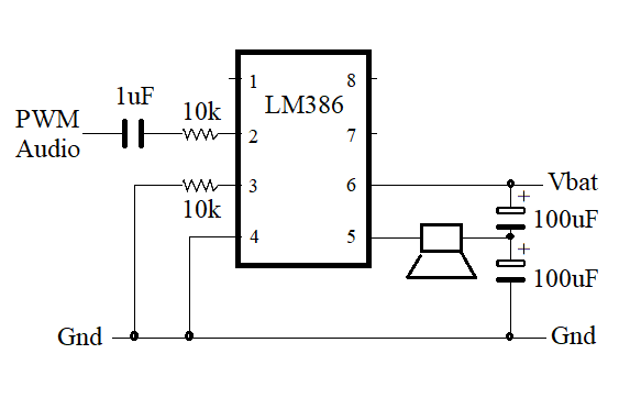 The main reason for using the LM386 is Tom has them. Second reason is simplicity. Yes an output filter would be nice but the inductors Tom has have too much resistance. Upping the PWM frequency to 132.3kHz reduced the idle PWM current through my speaker to about 30mA without any extra inductance. |