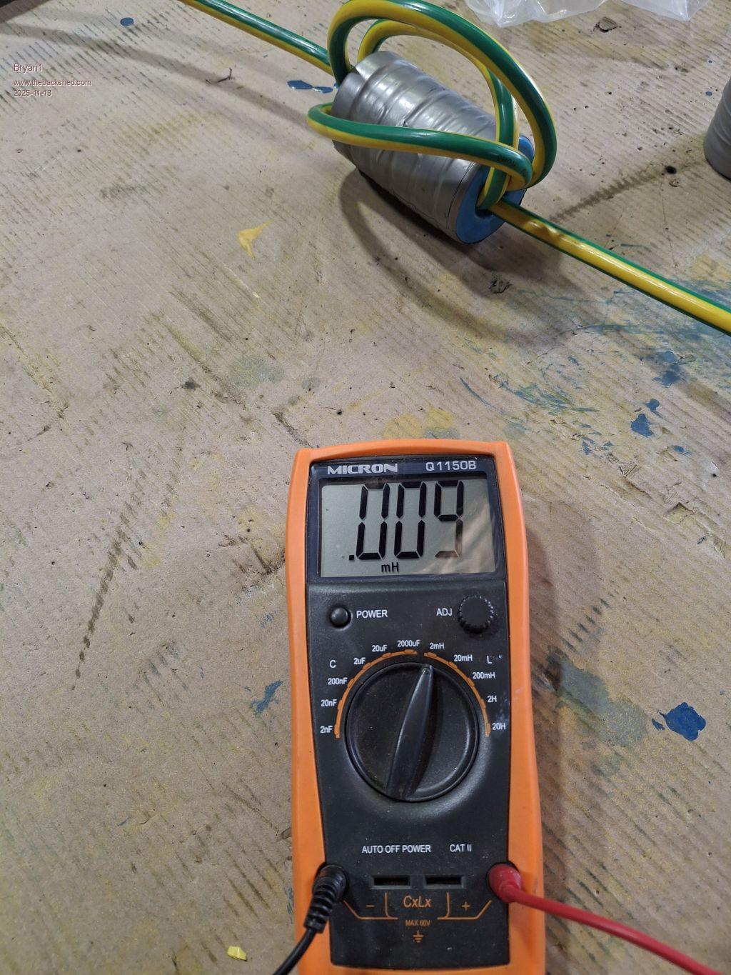 Well we did find some time at work and had the first try and soon found the 35sqmm wire was cut too short. So went with a longer length and only got 3 turns thru with no chance of a fourth turn. I am glad I took my inductance meter to work and several goes did say the same result 9 UH So a question for the brains trust is 9uH too low for a choke. ![]() We didn't bother winding the second one and I do have plenty of 35sqmm cable here to play with, just that it's green/yellow as that what we used. The 35sqmm welding cable has a double insulation and 2 turns will be a test so that why we went with the earth wire. |
