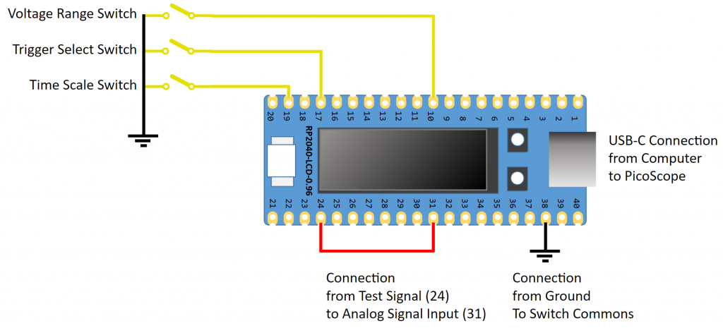 Thanks for all the comments! I specifically set about doing this so that other displays could be used, even VGA on a Colour Maximite 2. I tried to be very careful about identifying sections of code that were dependent on the RP2040-LCD-0.96, and of course there will be some variations of MATH libraries, framebuffer memory capacity, etc. on other boards. Mick has sensibly added protection circuitry to the inputs and scaling circuitry to the test signal output, but here is my "barebones" circuit diagram: ![]() Unfortunately, the RP2040-LCD-0.96 doesn't have a touch screen. That would eliminate the need for the external pushbutton switches. The PicoScope code runs pretty much without any changes on a Waveshare Pico-Eval-Board, but you need to set up its display appropriately with OPTION commands. Unfortunately, the P-E-B doesn't have i/o connections run out to accessible connectors. On the P-E-B, I set the analog input to that of the light-dependent resistor ("LDR" in the circuit diagram), and blink NeoPixels at it to view the resulting waveform. This all started out for me as an exercise in exploring PicoMite and WebMite variants of MMBASIC, and has since taken on a life of its own. Live in the Future. It's Just Starting Now! |