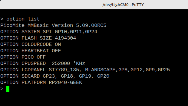 Option lcdpanel console/noconsole should not be used in a program and I will block this. It is deprecated in this usage. Use OPTION CONSOLE SERIAL/SCREEN/BOTH to control output from PRINT statements. This is a temporary option that is reset whenever a program terminates. In the next release I'll also add OPTION CONSOLE NONE as an option and in this case it will be reset by an error so error output isn't missed. |