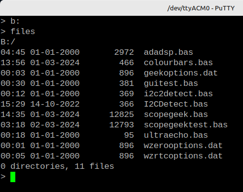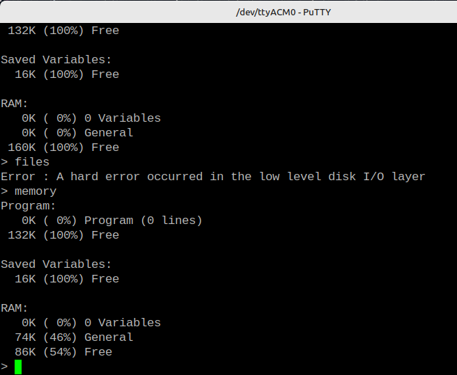 Hi All; I have tried 6.0RC6 on a number of my PICO builds and have not had any problems except when I tried it out on the RP2040-Geek. It worked properly on 5.9.0RC5 as in the screen shorts below; ![]() ![]() ![]() Cleared with clear_flash.uf2, Loaded 6.0RC6 shown with memory command, this shows normal at first. ![]() Executed Option Reset RP2040-Geek ![]() Executed B:[ENTER], note memory still looks normal ![]() After executing the FILES command I got a drive error and the memory usage changed. ![]() It would not read any sd cards that could be read on other PICO's. Reading the A: was not a problem. After I reloaded 5.9.0RC5 I was able to read the same SDCard again. I have done this exercise twice now with the same results. If you need more information please ask. Thanks, Hans ... |