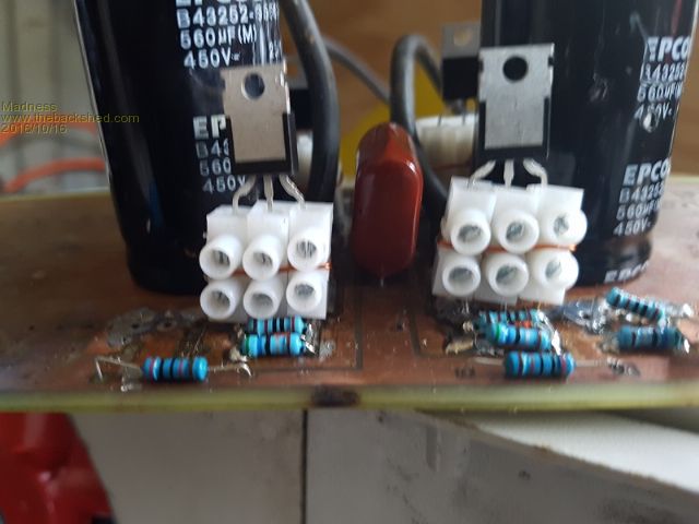 First off my CRO was not working and I had picked up somewhere the wrong values for the snubbers(103 3KV cap and 2W 47r is correct), had a few spectacular failures from that. Flying blind made it even worse, I even made up an easy way to swap MOSFETs without soldering.