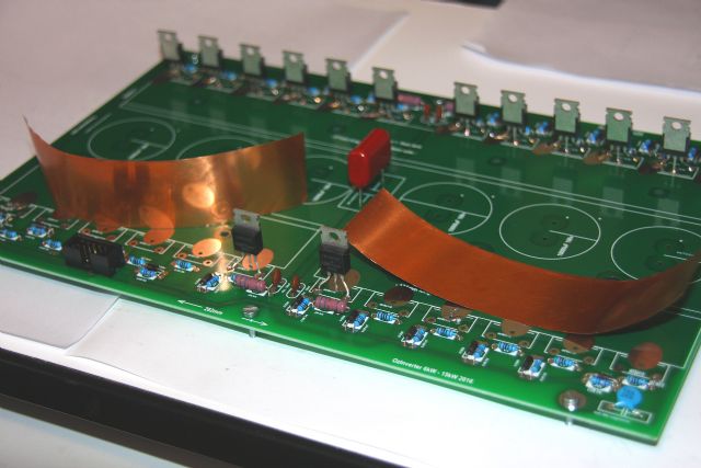 Because solder mask is hard to get off I took another move and scratched only some additional joints in the middle of PCB for copper sheets. Then solder it with hot air station behind each FET and on those joints. These sheets shall provide useful contacts to both heat sinks. Board is populated with all FET's and for now operates well.