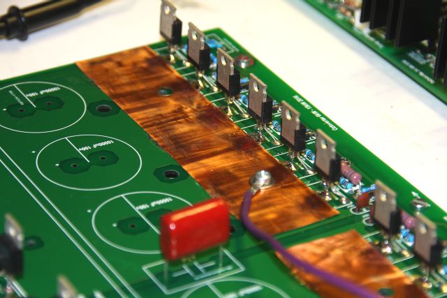 I wonder why you bother with that copper foil. It does not help unless for some reason you put insulating washers under the mosfets. The metal surface on the mosfet conducts the high current to the heat sink, it is at the same potential as the middle pin (drain). So, the aluminium heat sink is the big current conductor with this design, three of the 4 power wires terminate on the heat sinks.